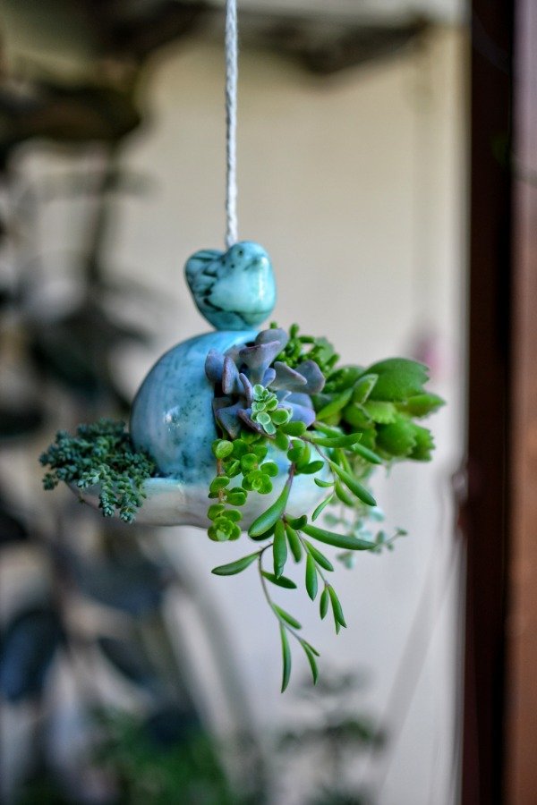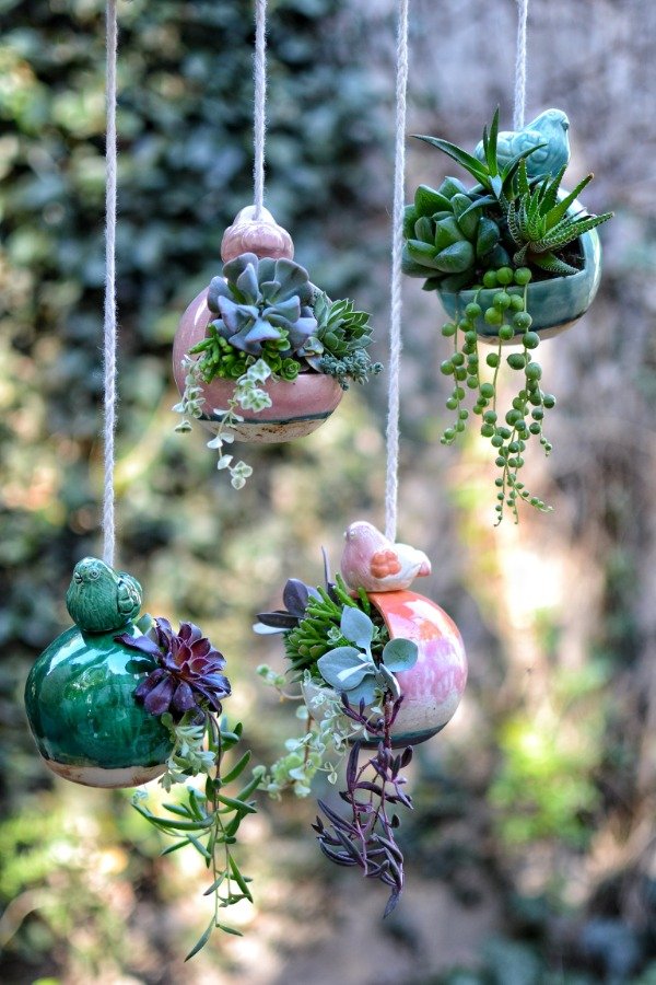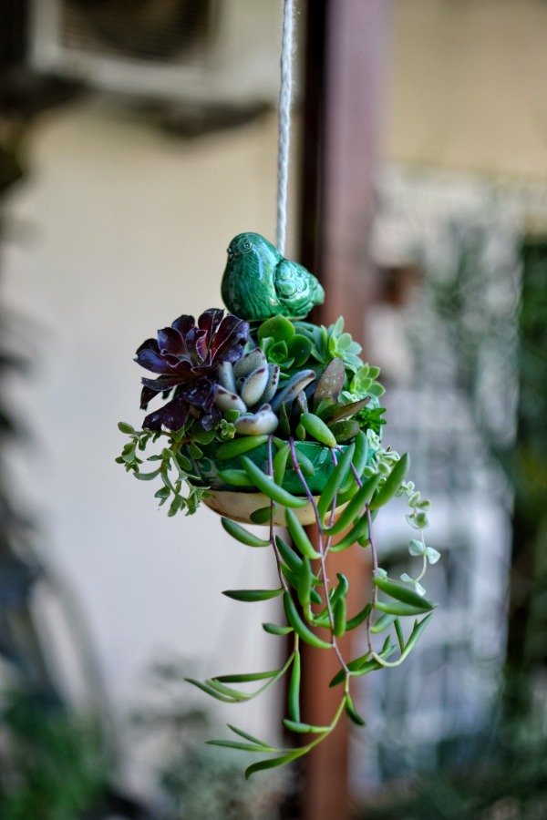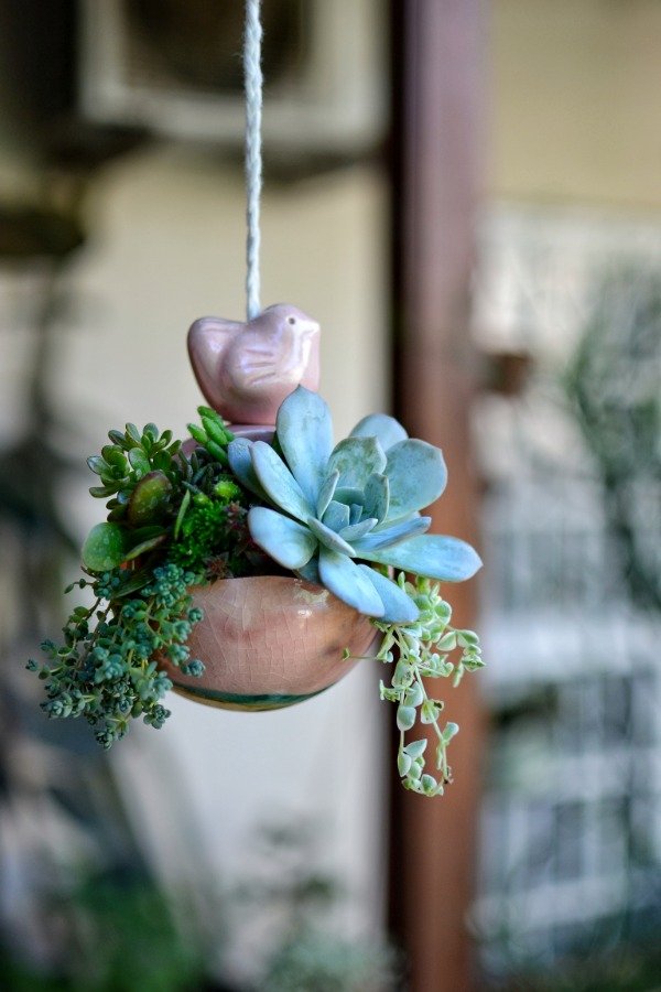 Composición de suculentas en maceta esférica de cerámica con detalle de pájaro.